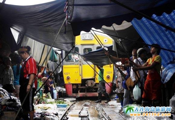 總忘不了有一個(gè)紀(jì)錄片的場(chǎng)景,當(dāng)火車來臨的時(shí)候,鐵路兩邊的小攤販紛紛收起棚子和小攤子,當(dāng)火車呼嘯而過的時(shí)候,他們就貼著火車站立在兩旁,感覺火車就要壓過他們的菜攤子,可堪稱“最危險(xiǎn)的菜市場(chǎng)”,這里就是泰國(guó)著名的美功鐵道市場(chǎng)(Maeklong Railway Market)。如果要去泰國(guó)的丹能沙都水上市場(chǎng)和安帕瓦水上市場(chǎng)的時(shí)候,很多人一定會(huì)在夜宮府的美功鎮(zhèn)下車,為了去一睹火車穿過菜市場(chǎng)那一精彩的瞬間。