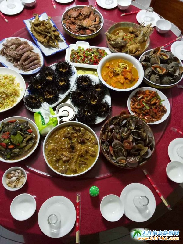 【早餐】 面包、牛奶、本地雞蛋、海邊鴨蛋、魚干兩種、小菜4道、饅頭、綠豆粥;【午餐】 煮鮑魚、煮飛蟹、煮海螺、煮扇貝、燉黑魚、清蒸老板魚、辣炒蜆子、炒烏魚花、煮莊河特產蛤叉、龍須拌蜆子、蕓豆排骨、炒本地雞蛋;【晚餐】涼拌海參、煮大蝦、煮蝦爬、蒜泥夏日貝、煮蟹甲紅、糖醋干燒魚、燉黃魚、煮銀耳鮮、煮蠣黃、炸黃花魚、燉莊河大骨雞、燉殺豬酸菜(排骨、肘肉)
