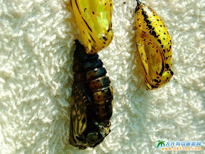 中,看到剛剛即將要羽化成蝴蝶的臺灣大帛蝴蝶蛹,盡管沒有蝴蝶那樣的嫵媚,但是其金燦燦的外表也足以驚艷無比,這也是蝴蝶生命中的一個璀璨的過程。