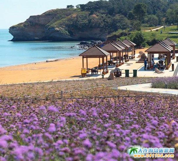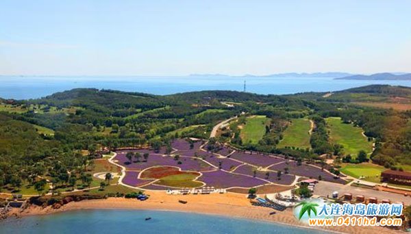 站在大連金石灘心悅島文化休閑公園觀景臺上瞭望,紫色花海盡頭就是藍(lán)色的大海,金黃色的沙灘更是與周邊綠色的草坪、森林相得益彰。