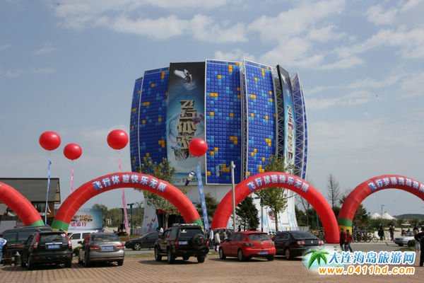 坐落在大連金石灘黃金海岸邊的太空飛行體驗館是一座高大的圓柱形藍色建筑,建筑總高23米,直徑21米,由15片藍色風車葉片和白色的“座裙”組合而成。內部則是由全透明鋼化玻璃組成的直徑3.3米、高9.3米的的國內最大最高的立式風洞——“飛行體驗艙”,體驗艙具有良好的密封性,既能保證外壁抵抗巨大氣流的壓力,也能確保內部氣流的順暢運動,頂部則由5臺風機組成。大連金石灘旅游度假區