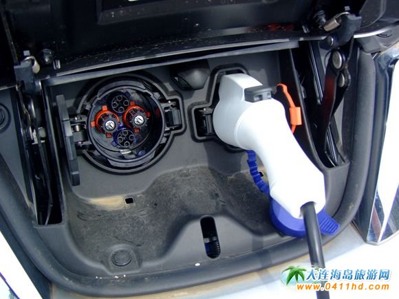 電動車的概念已經認識了很多年,但是真正落地展現真容還是第一次,先帶著好奇圍著車體轉一圈;看看車的外觀,前面看挺普通的,后面看卻大不相同,有屁股,沒屁眼!也就是說沒有排氣管,說明了這臺車是沒有任何氣體排放,也不奇怪,不燒油也不燃氣自然不需要尾氣排放,特征充分說明此車絕對環保綠色。同時想到,就算是下大暴雨天趟個水過個小河啥的也不用擔心尾氣管進水了。打開前機關蓋,最大亮點是沒有了發動機的缸體,而是被另一種點動力機關”同步永磁電機”所替代,機關上商標是日本廠家的,看來核心技術還是需要引進才。在機關蓋前也就是通常”鬼臉”的位置上,也有個小小的機關蓋,打開后,則是這臺車能量供給源,充電口,充電口中有兩個插座,可根據電壓大小以及充電快慢進行選擇。