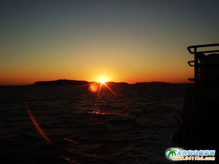 圖片中,遠處的島嶼就是馳名中外的獐子島,我們的客輪由西向東行駛,回首望去,一輪火紅的落日將天邊染紅,獐子島的山巒與余暉組成了一幕和諧的曲線,那在剪影中迸出的火紅色與天空的灰黑形成的漸變把冷秋裝飾的暖意融融。