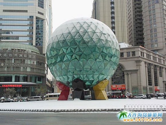 友好廣場環島中央的巨大水晶球,重117噸,直徑為15米,表面由3120塊鍍膜和透明玻璃圍合而成。內中有紅黃綠彩色燈7852只,由計算機程序控制,夜晚變幻著各種絢麗的色彩能產生出旋轉的效果。球身下方,托起水晶球的是黃、黑、紅、白、棕五種顏色的巨手,它與五大洲不同民族的膚色是一致的,與中國傳統的五色土相同。它象征著五大洲各族人民友好相處,共同建設一個星球,合力托起大連這顆美麗的明珠。