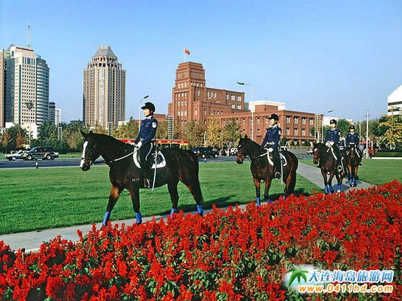 大連市政府前的人民廣場,是市級行政機關集中的城市中心廣場,行政和司法機關集中,廣場布局對稱,綠草茵茵,長廊悠遠,噴泉隨著音樂起舞,整個廣場莊嚴又美麗。廣場上的女騎警更是英姿颯爽。