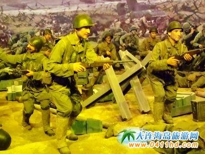大連金石蠟像館二樓《世界風云》展區包括人物馬克思、恩格斯、列寧、克林頓、尼克松、普京、二戰三巨頭丘吉爾、羅斯福、斯大林在參加雅爾塔會議,對面是希特勒。最大的亮點諾曼底登陸,諾曼底登陸您現在看到的這個壯觀、恢弘的場景就是舉世聞名的諾曼底登陸。這個場景也是我們蠟像館精心打造的,整個場面猶如把真正的諾曼底登陸搬到了室內一樣,這陸地是工人用沙子混凝土制作而成,做出了真正陸地的效果,抬頭向上看去,一駕長達三米的大飛機臨空懸浮,再加上音樂特效的配合更把整個場景顯得大氣壯觀。其它蠟像還有新加坡國父李光耀、德國總理科爾、巴勒斯坦民族權力機構主席阿拉法特、黑人領袖曼德拉、聯合國第六任秘書長加利、古巴領導人卡斯特羅、拉丁美洲革命領袖格瓦拉、奧巴馬、葉利欽、撒切爾、戴安娜探望黑人殘疾兒童、陳嘉庚、何厚鏵、李家誠。