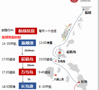 途徑熱點景區: 砣磯島、萬鳥島、大黑山島抵達長島、打破傳統單調航行路線,海上觀光為主,讓旅行不寂寞.
