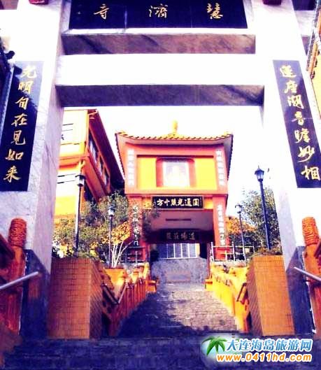 慧濟禪寺慧濟禪寺,又稱佛頂山寺,坐落在海拔299.1米的云霧山中。原為一石亭,供佛其中,明代僧慧圓創(chuàng)慧濟庵,至清乾隆五十八年始建圓通殿、玉泉殿、大悲樓等,擴庵為寺。光緒三十三年清得大藏經,由文正和尚鳩工增廣,遂成巨剎,與普濟寺,法雨寺鼎立,稱為普陀山三大寺。145間殿堂樓閣隱于翠綠叢林,用彩色琉璃瓦蓋頂的大雄寶殿,在陽光照射下呈“佛光普照”奇景。1989年建成的觀音堂,四壁鑲嵌著123尊石刻觀音像,它匯集了唐宋元明清五朝名畫家的杰作。