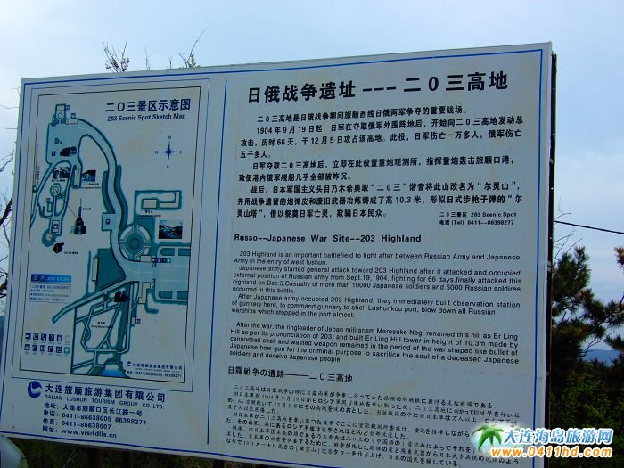 二○三景區位于旅順國家級森林公園之中,距旅順市區3公里,占地近50萬平方米。景區內保存有大面積四季常青的黑松林和3.3萬平方米的櫻花園,是國家森林公園、省級文物保護單位。 203高地是日俄戰爭期間旅順陸戰中西部戰線最激烈的主戰場,因海拔高度203米,故稱之為“203高地”。1904年9月9日始,日軍出動兵力6.4萬人,由第三軍司令乃木希典親自督戰,先后向203高地發動了70余次沖鋒,最終以1.7萬人的傷亡代價,于當年12月5日攻占該高地。