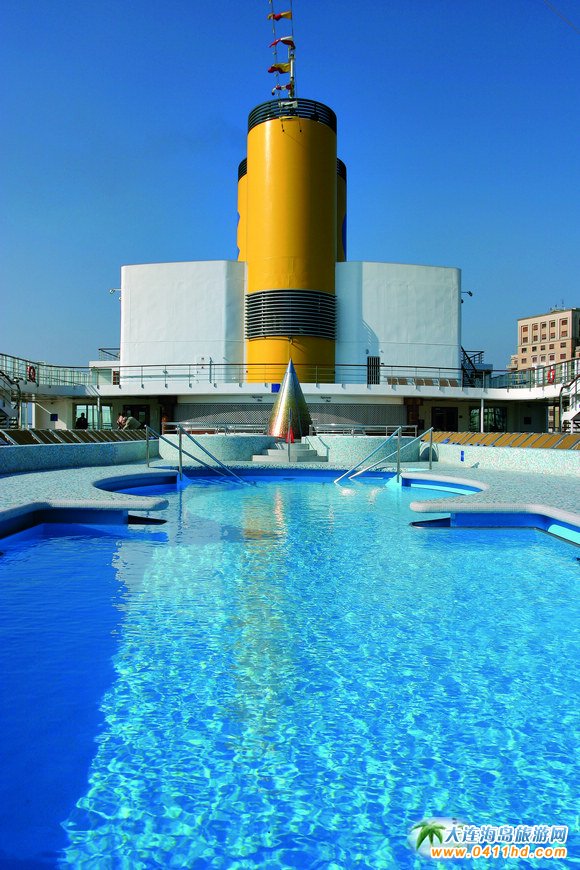 享用了豐富的早餐后,您可在甲板上的游泳池里,享受戲水暢游的無限樂趣,船上裝飾華麗的購