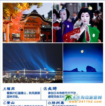 福岡-太宰府及國立博物館(維多利亞號號2012夏季行程) 約330分鐘 游客離開港口之后,將駕車前往首個目的地:「太宰府天滿宮」。在這個占地達三千英畝的幽靜的寺院內(nèi),種有六千多棵李樹,絕佳美景,天然而生。參觀過后,將步行前往附近的「九州國立博物館」。此館是展現(xiàn)日本獨特文化遺產(chǎn)與亞洲地區(qū)文化交流的新型博物館。最后,游客可于天神百貨商店,自由購物兩小時,然后才返回郵輪。