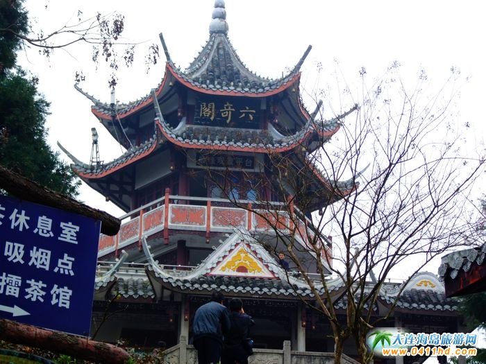 六奇閣位于張家界森林公園黃石寨頂的人工建筑。因張家界國家森林公園”山奇、水奇、云奇、石奇.樹奇以及珍禽異獸之奇”而得名。閣分3層,黃瓦蓋頂,飛檐翹角,畫梁彩棟,回廊石欄。登閣憑眺,滿目佳景。閣柱楹聯日:“翠鬟煙籠,綠樹云封.昔日曾遮半個面:麗質天生,畫圖省識,今朝始醉四方人。”又一聯云“名動全球,到此實堪三擊掌:勢拔五岳,歸來不用再看山。”閣內設有土家風情歌舞樓.竟日絲竹弦管,清音繞梁。
